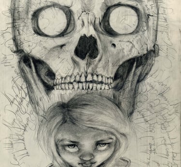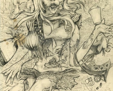 Traditional illustration is grounded in physical materials—pen and ink, pencil, charcoal, watercolor, gouache—and the immediacy of hand-to-surface contact. It's about texture, pressure, accident, and the unique qualities that emerge from working directly with tools and paper. This approach allows for expressive line work, organic textures, and a tactile presence that digital methods often reference but cannot fully replicate. My traditional illustration work includes character design, editorial illustration, book art, concept sketches, and fine art pieces—often later scanned and integrated into print or digital workflows while preserving the raw energy and detail of the original.