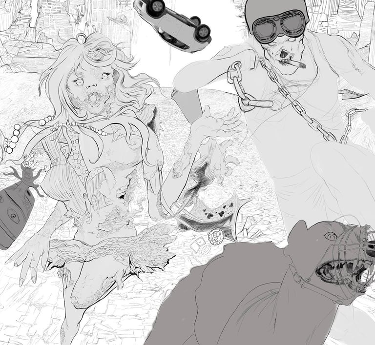 Mixed media illustration blends the best of both worlds—combining traditional hand-drawn elements with digital tools and techniques to create layered, textured, and visually rich compositions. This approach might begin with ink sketches, watercolor washes, or collage elements that are then scanned, refined, colorized, or composited digitally in Photoshop or Illustrator. The result is artwork that carries the organic warmth and imperfection of traditional materials while benefiting from the control, flexibility, and polish of digital workflows. Mixed media is ideal for projects that demand both artistic character and production versatility—such as editorial illustration, book covers, packaging design, posters, and concept art—where depth, texture, and narrative complexity come together in a single, cohesive image.